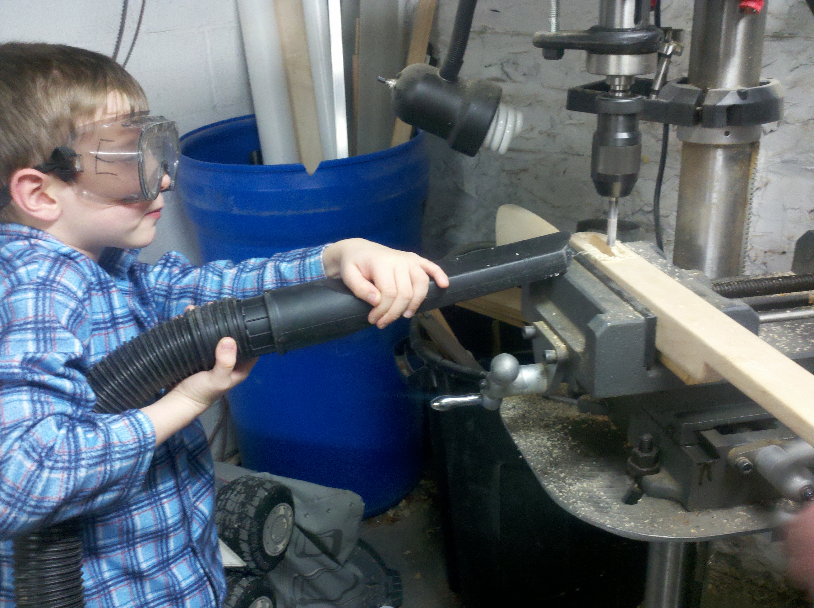 Here is Mr. E holding the shop-vac to keep the end mill from clogging up. My Sherline milling machine is not large enough to hold this stock conveniently, so we used a drill press and cross-slide vice to mill it out. Drill presses are not as rigid as milling machines, so we had to take it slow.