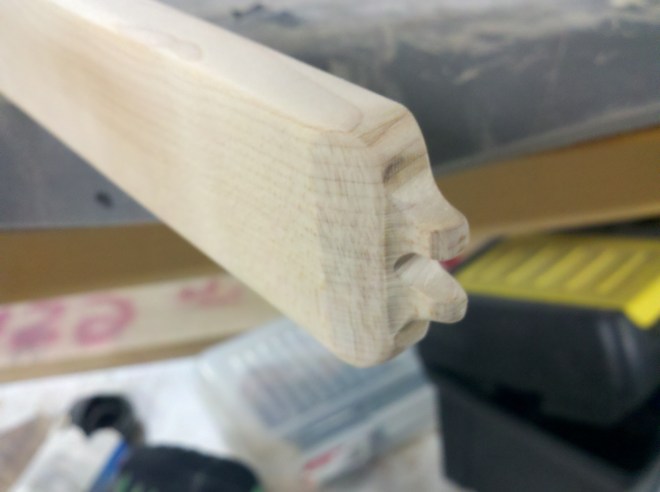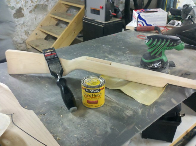 This stock was hand crafted out of solid 1.75″ x 6.0″ x 48″ slab of maple. The primary tools were bandsaw (for the profile), hammer and chisel, random orbit sander, end mill, jointer, sand paper, and lots of elbow grease.