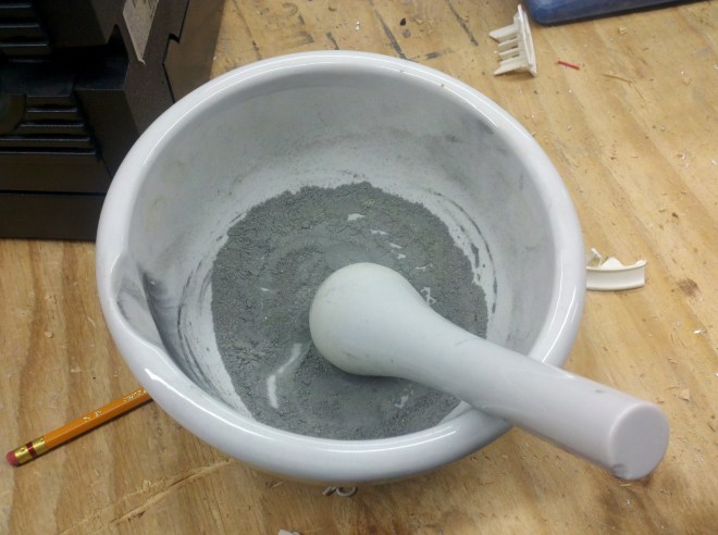 Second, we ground the charcoal to a powder, and added a some potassium nitrate and sulphur.