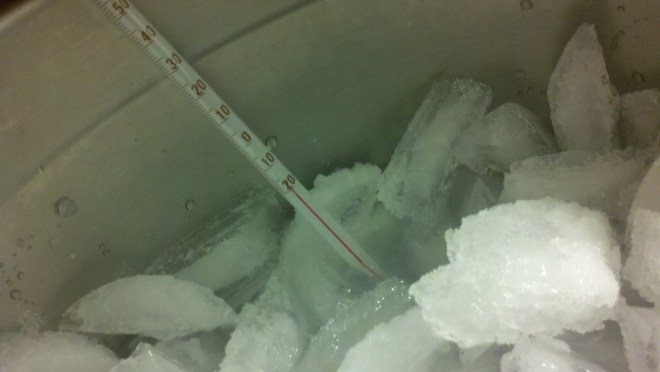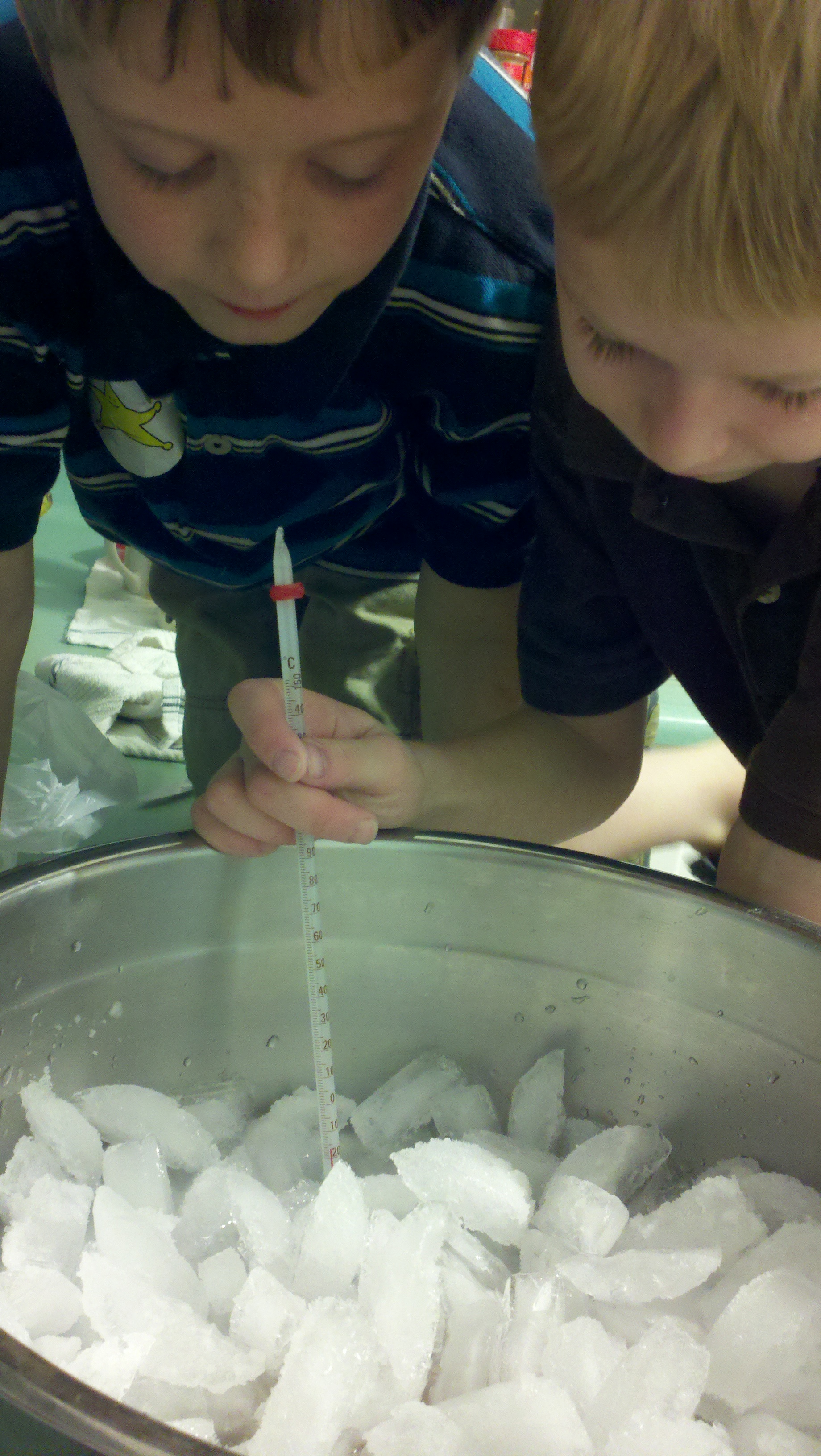 We had a bowl of ice the other day for some reason. We also had some salt for some reason. Maybe we were making ice cream? In any event, we thought it would be neat to see how cold it actually is (because it feels really, REALLY cold).
