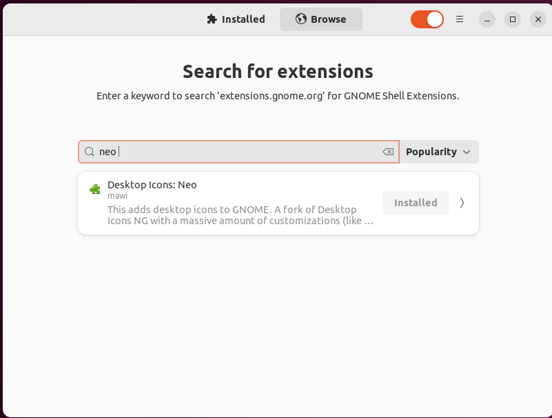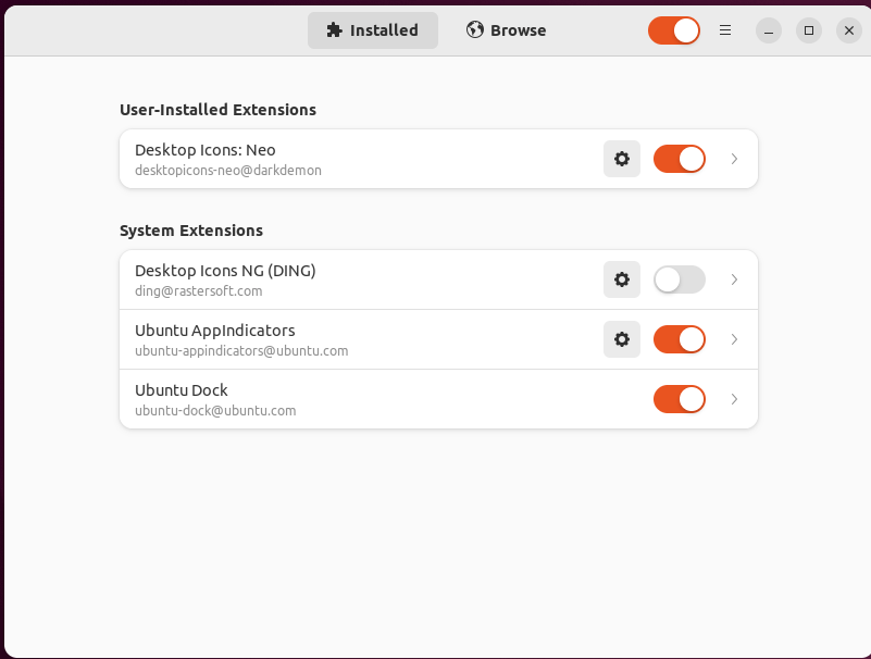 Go back to the Installed tab and enable it, and disable the other Desktop Icons NG (DING) extension