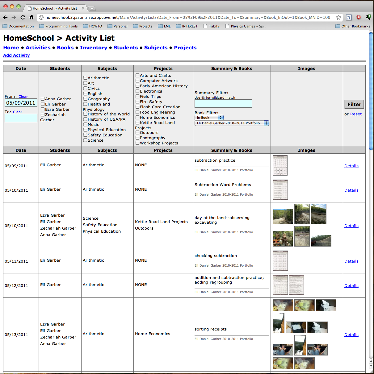For every activity, you can attach an unlimited number of images.  They are stored in the database with all of the other data, so it’s easy to backup.  Also, I am using ImageMagick to resize them into various preview sizes for quick speeds while working with them.