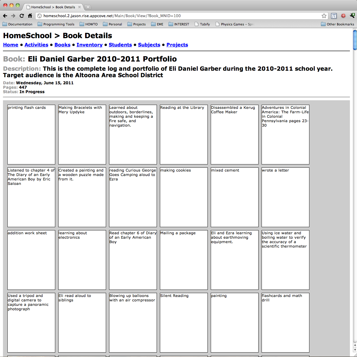 Having been home educated as a child, I recall the massive effort it took to remain organized enough to be able to assemble a really good portfolio at the end of the year.  Also, the log book needed to be throughly kept to provide record of education activities.