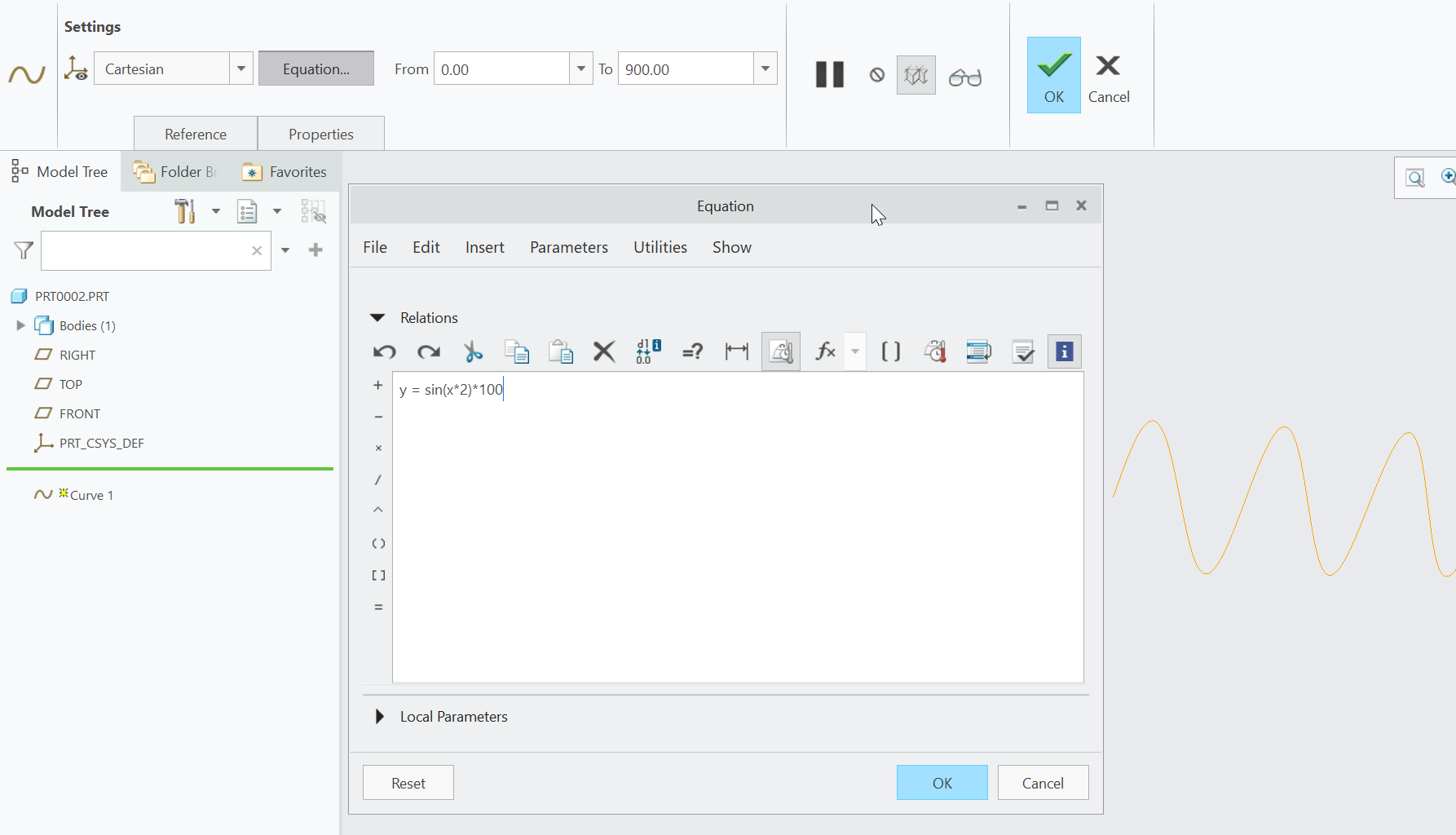 And told Creo to extend it from x=0 to x=900. Here is a picture of editing the equation.