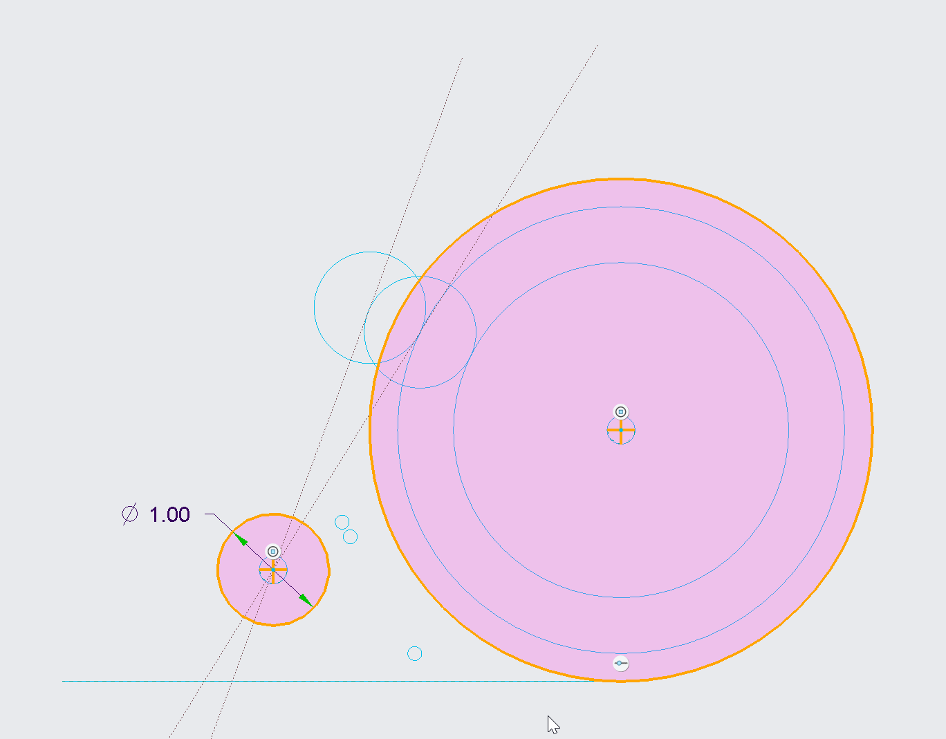 In this case we wanted to make sure that the follower, despite it’s curved shape, moved perpendicular to the surface of the wheel. We created a series of 4 sketches using many construction lines (which don’t show up after you exit sketching mode). These sketches described the key interface and clearance parts of the mechanism, including the maximum and minimum location of the follower as it rides over the highs and lows of the cam wheel. Using this geometry, we could accurately place the tension spring to put a calculated amount of force between the two parts, while ensuring that there was no part interference.